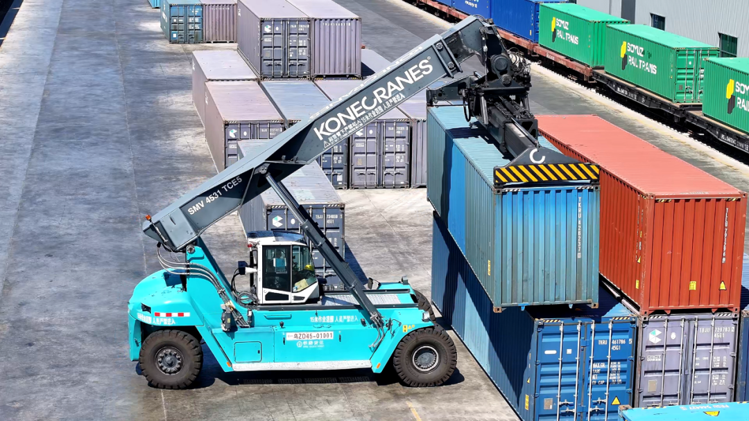 装卸作业人员正驾驶正面吊,有序进行中欧班列集装箱换装工作。格日乐图 摄