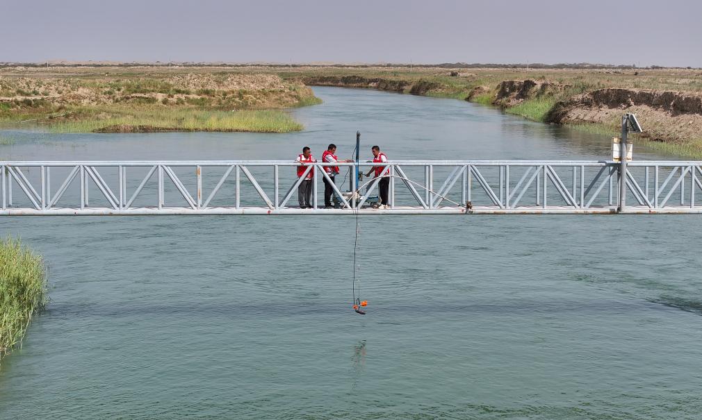 8月6日,新疆塔里木河流域干流管理局下游管理处大西海子水库管理站工作人员对生态水下泄流量进行监测。