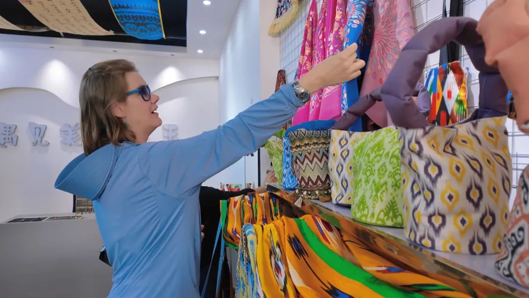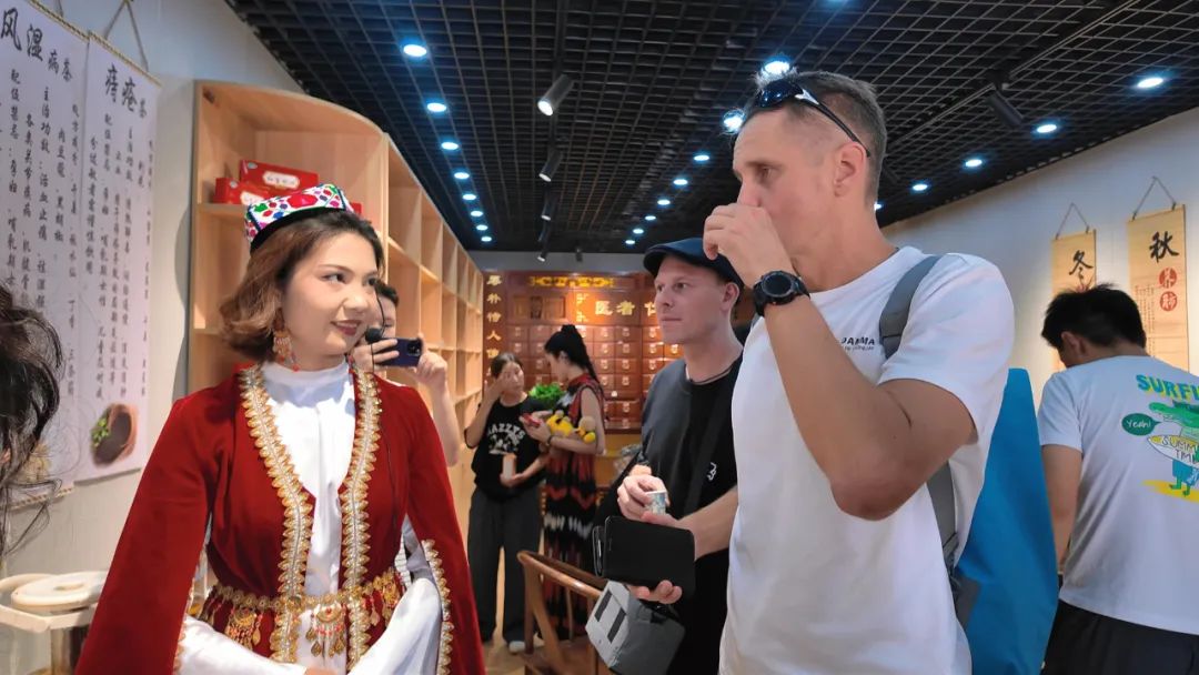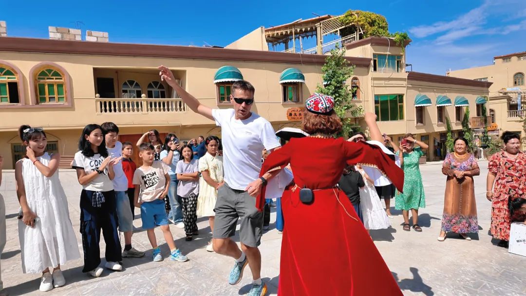 步入墨玉老城,67家商户精心陈列的非遗、文创与工艺品令游客目不暇接。艾德莱斯绸的绚丽色彩、奎牙小刀的匠心技艺引得游客频频驻足;维医体验馆内,药茶飘香,游客品味着民族医药的独特智慧。传统投壶游戏区笑声不断,而当茶馆与巷道中响起欢快旋律,游客与墨玉群众即兴共舞的热情瞬间点燃了整座老城,民俗风情在互动中焕发勃勃生机。游客杰伊·柯瑞克斯说:“虽然我来这里只有20分钟,但是我爱这个地方,这里人很多、很热情,他们都是我们的朋友。这里天气也很特别,我们都很喜欢这里。”
