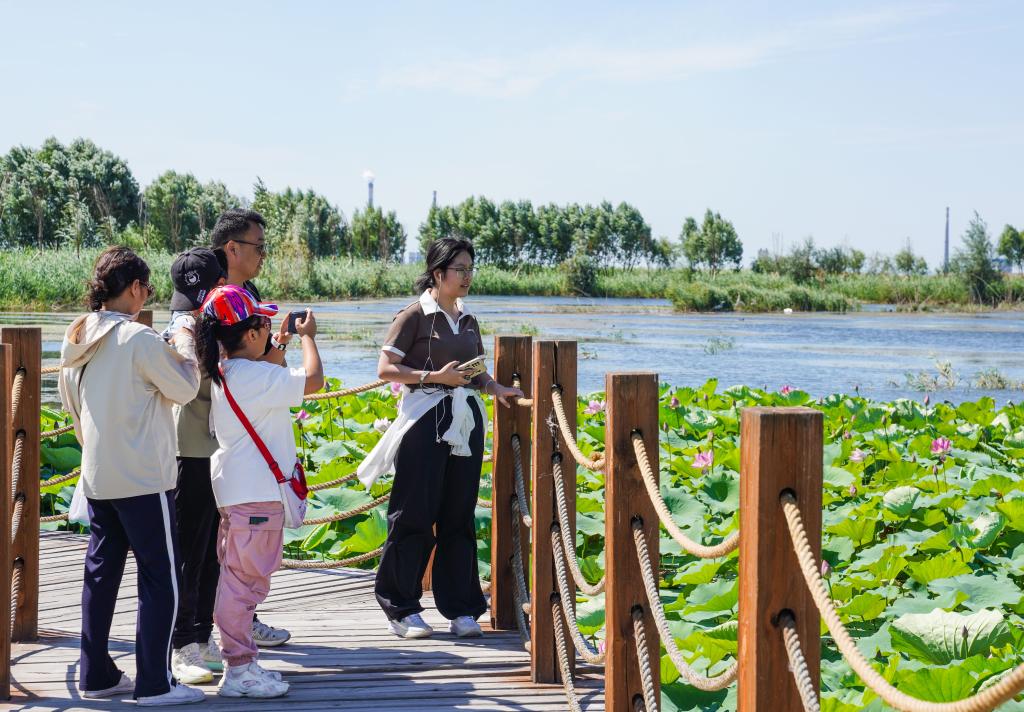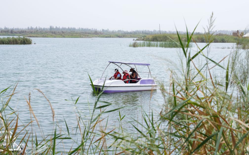 8月10日,游客在玛纳斯国家湿地公园游玩。