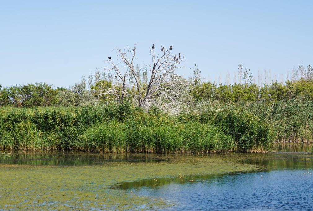 8月10日,鸬鹚在玛纳斯国家湿地公园树枝上栖息。