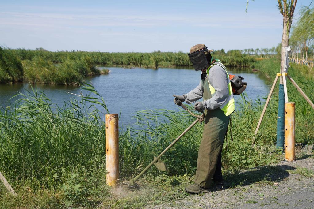 8月10日,工作人员在玛纳斯国家湿地公园清除杂草。