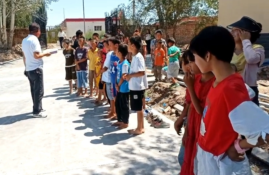 8月8日,新疆阿克苏地区温宿县共青团镇尤喀克佳木村泳池正式投入使用,村干部在给村里小朋友们做游泳的安全教育。(梅红红 摄)