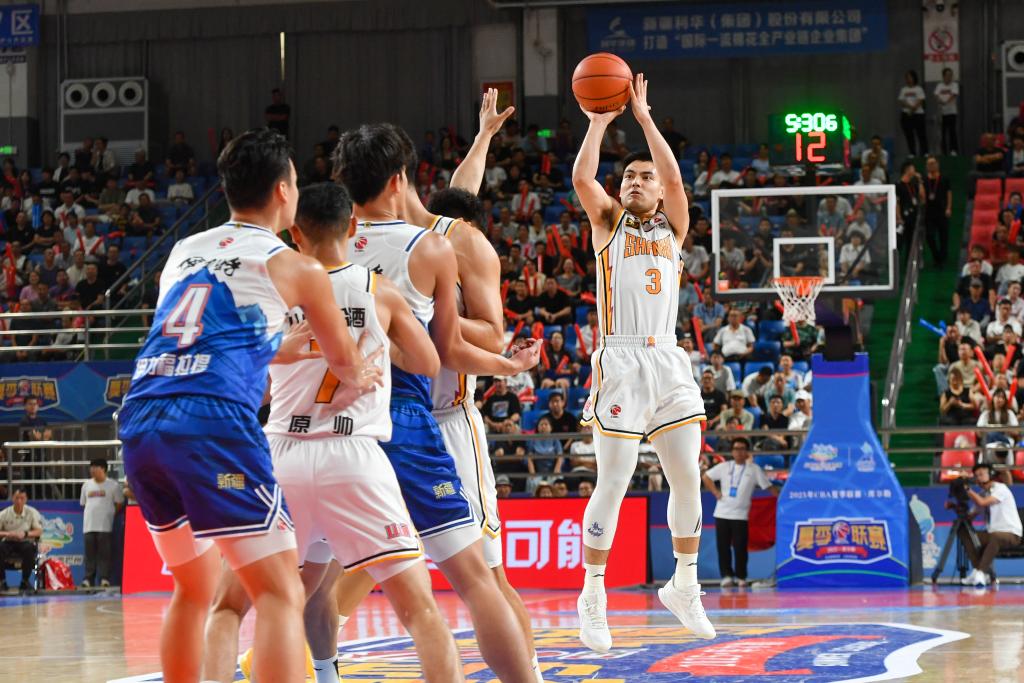 8月15日,山西汾酒队球员贾明儒(右一)在比赛中投篮。新华社记者 高晗 摄