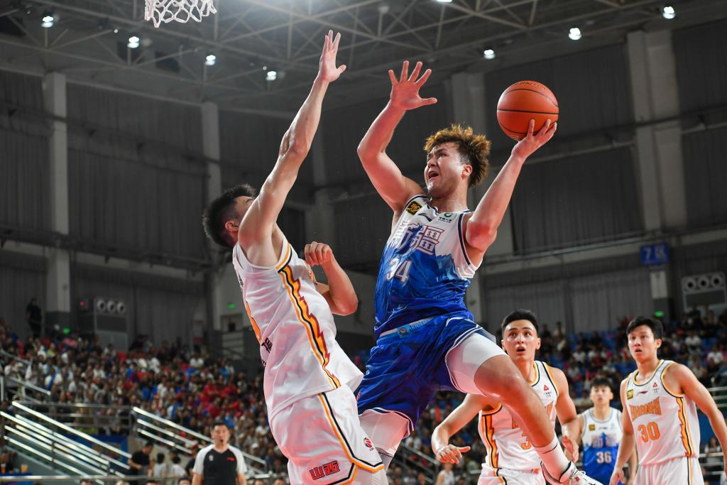 8月15日,新疆伊力特队球员葛浩然(左一)在比赛中持球进攻。新华社记者 高晗 摄