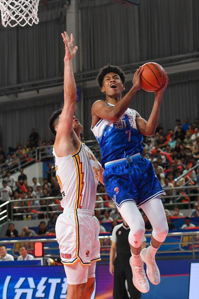 8月15日,新疆伊力特队球员冯傲(右)在比赛中上篮。新华社记者 高晗 摄