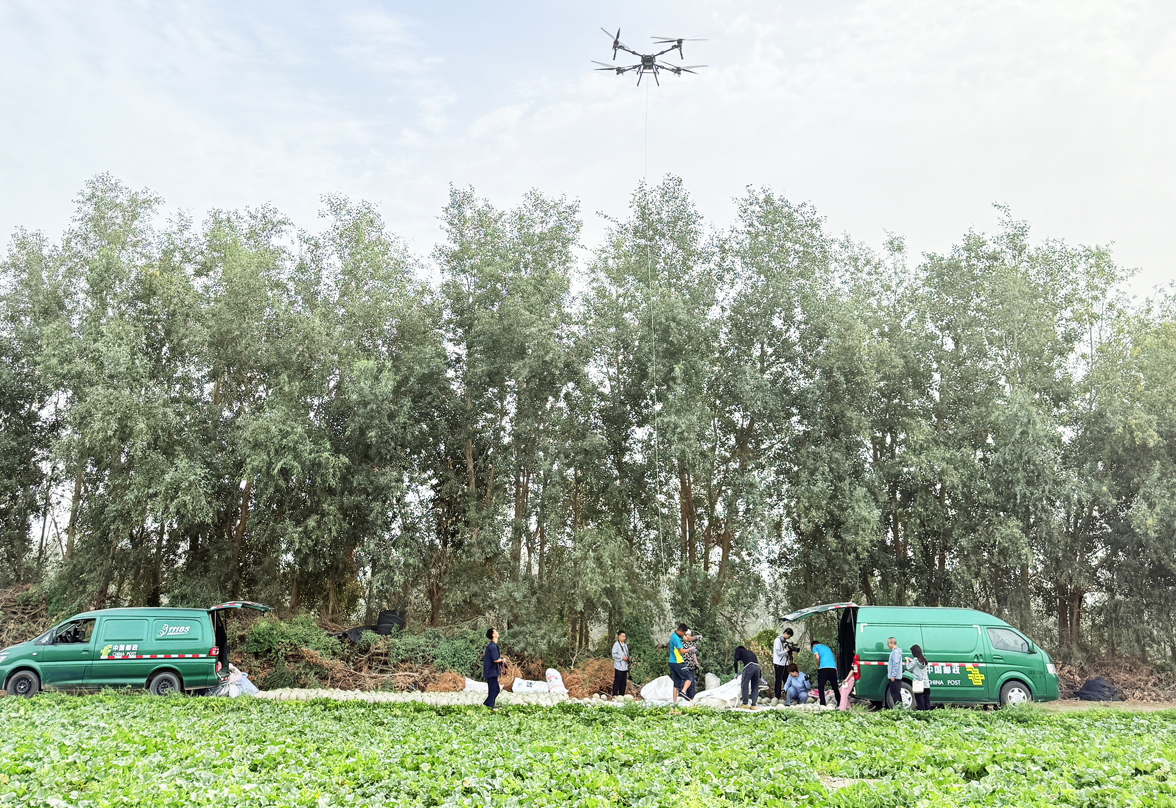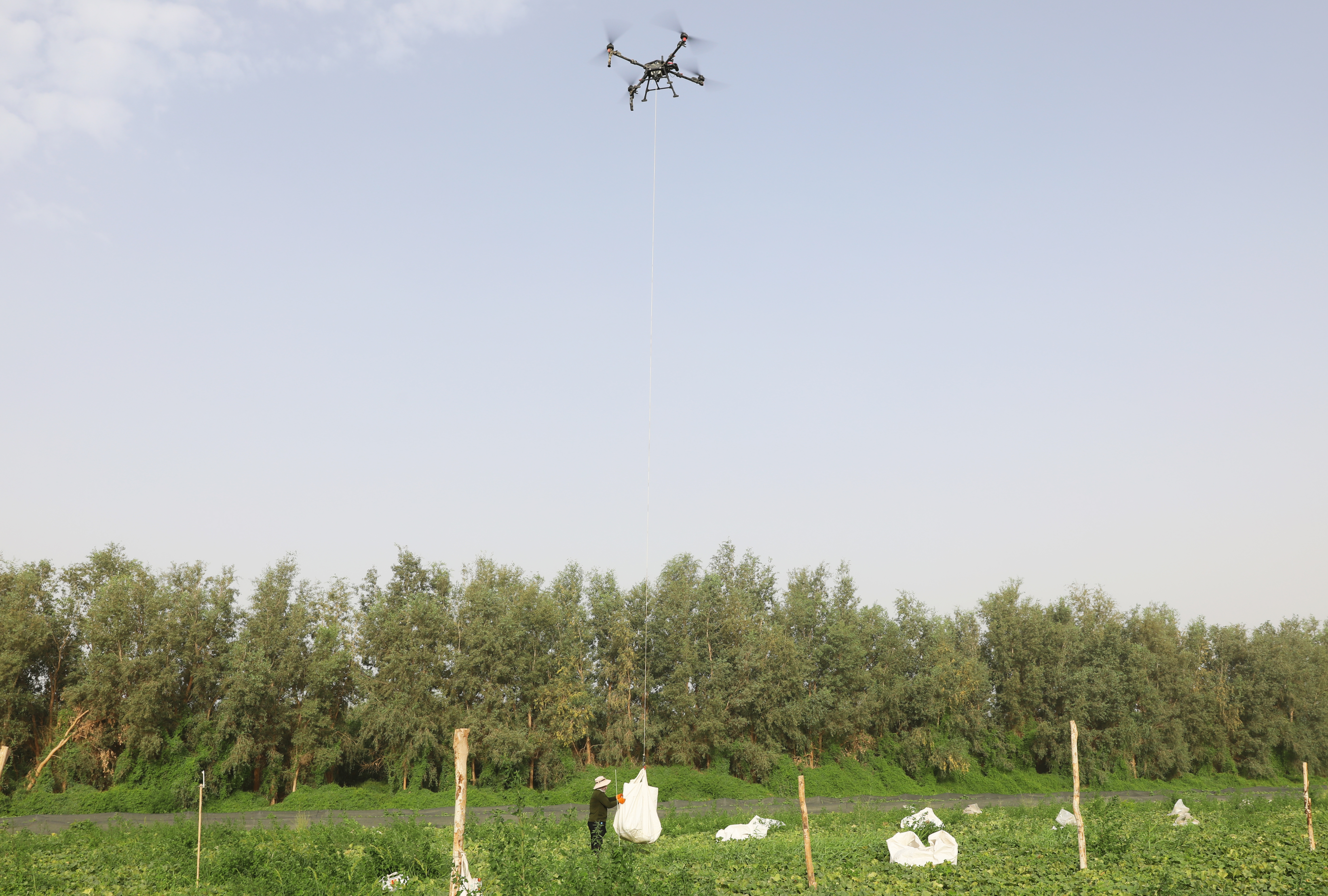 “飞手”娴熟操控无人机悬停在田间指定点位,瓜农立即将装有九成熟蜜瓜的编织袋挂上吊钩。仅用2分钟,无人机便将60公斤蜜瓜运至田埂边,接应瓜农将其轻卸于棉被上,全程耗时不足3分钟,又快又稳当。