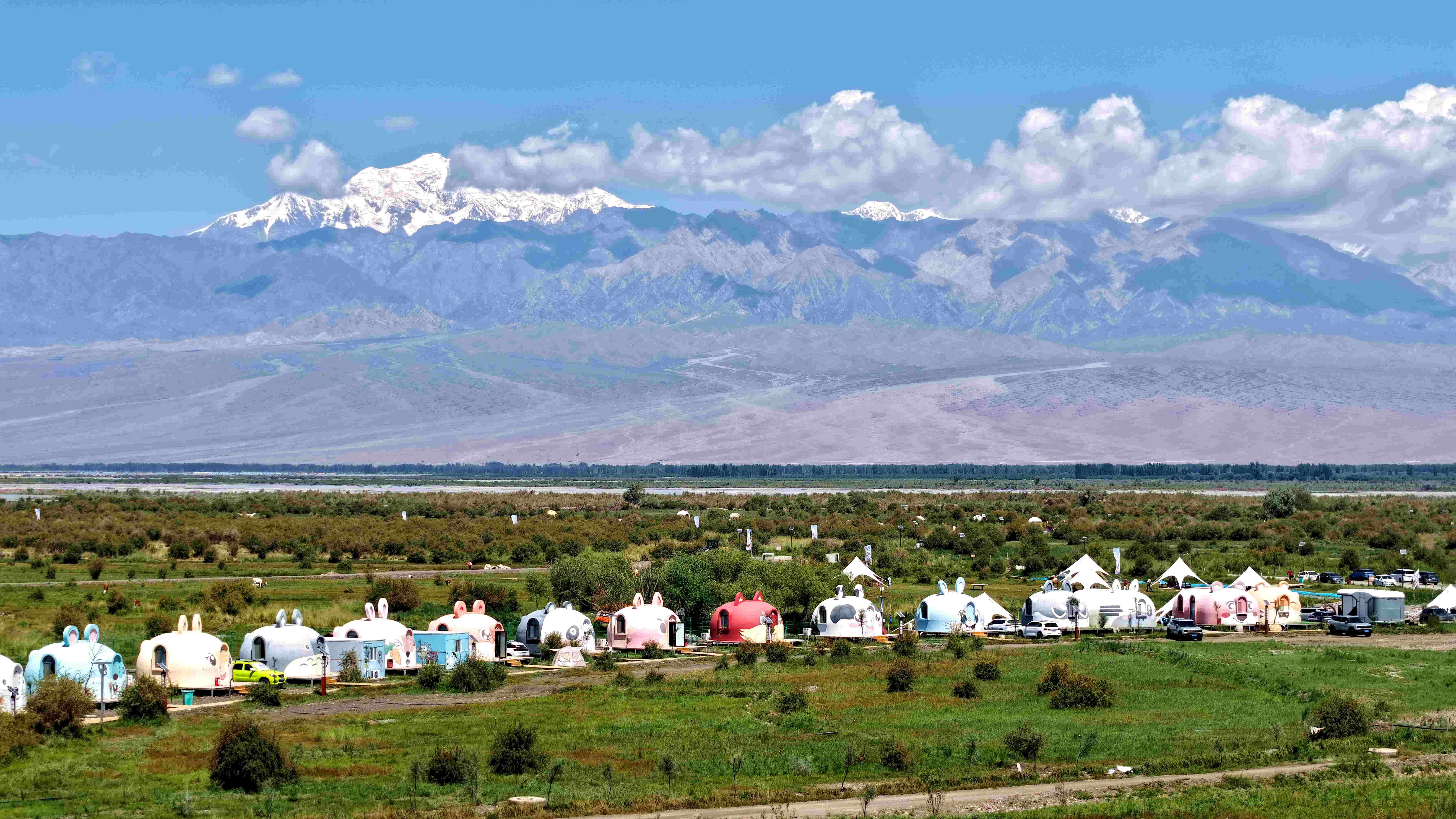 景区内,透着现代气息的星空屋与原始草地、远处的雪山形成人与自然共生的良好生态景观。林国强摄