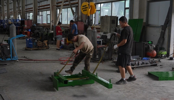 8月14日,在沙湾市新疆宏基智能农机装备制造有限公司车间,工人们正在焊接加工采棉机部件,吊装机器零部件。重点对采棉机的部分结构进行升级改造,更换动力系统,提高采棉机的动力。一旁已完成升级改造的采棉机排列整齐,蓄势待发。