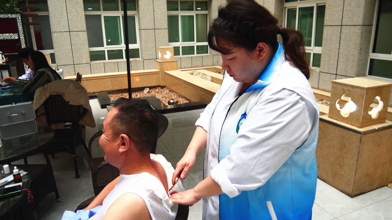 (医生为民警进行中医刮痧治疗)