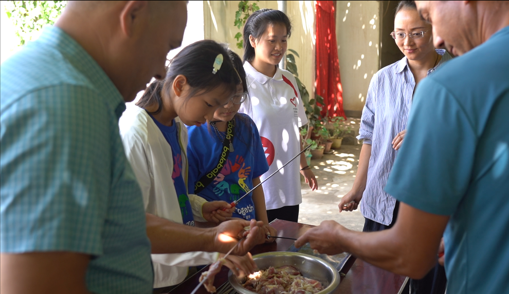 金华青少年研学团的学生们在农民党员家中学习穿羊肉串(耿易同 摄)