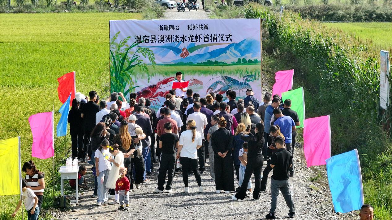 8月20日,温宿县稻虾综合种养示范基地人头攒动,“浙疆同心 稻虾共舞”——温宿县澳洲淡水龙虾首捕仪式在这里举行。由金华市援疆指挥部、托乎拉乡与新疆金温水产养殖有限责任公司联合开展的水稻——澳洲淡水龙虾综合种养试验取得成功,这标志着温宿县“稻虾共作”模式实现新突破,为当地农业产业融合发展再添新动能。