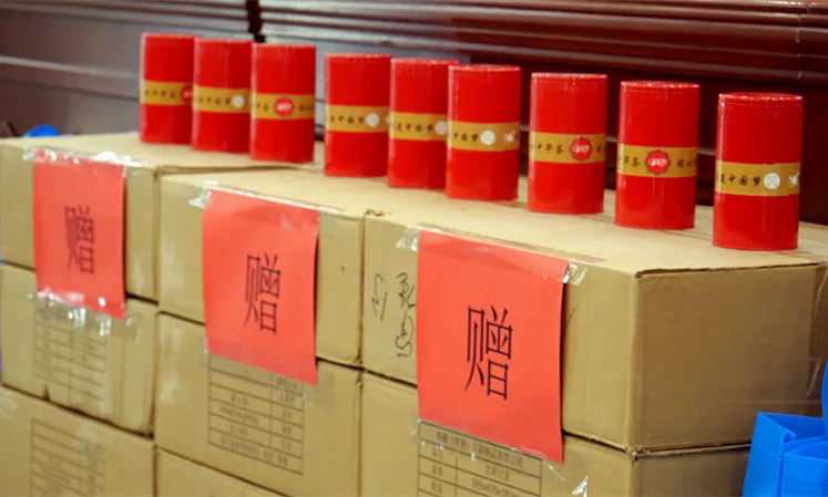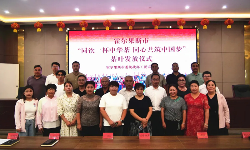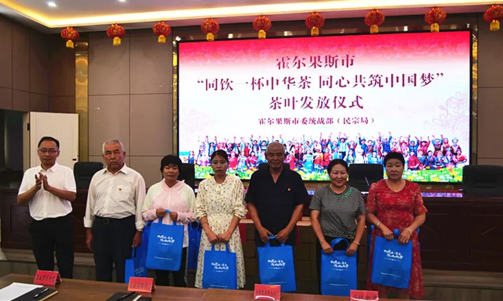 捐赠仪式上,一箱箱贴着“同饮一杯中华茶 同心共筑中国梦”标识的红茶整齐摆放,霍尔果斯市委统战部将爱心传递到社区代表、一线工作者和居民手中。