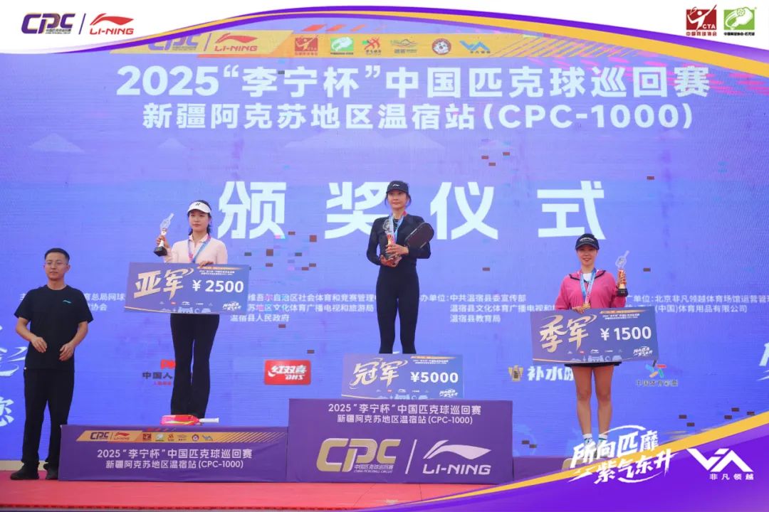 8月24日,为期两天的2025“李宁杯”中国匹克球巡回赛新疆阿克苏地区温宿站(CPC-1000)在温宿县第三中学圆满收官,公开组女子打单冠亚军上台领奖。(组委会供图)