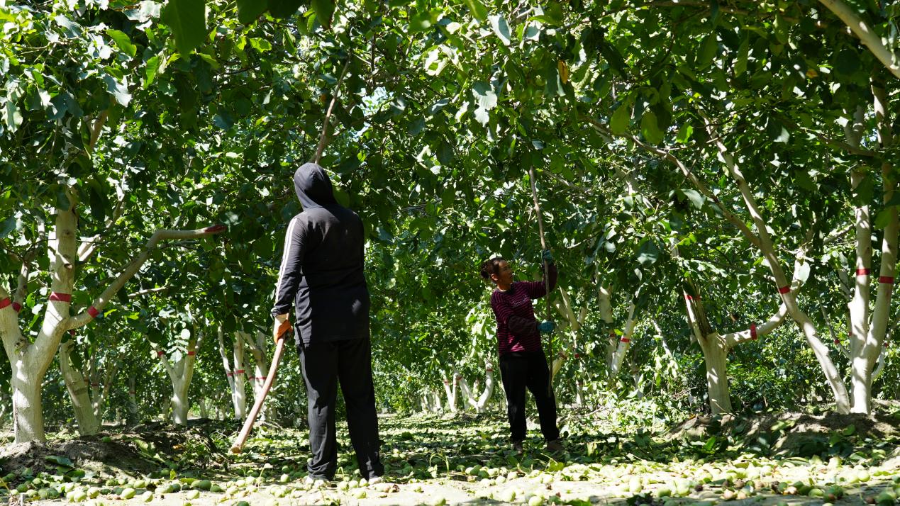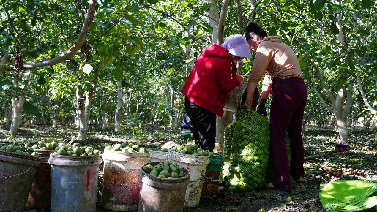 走进温宿县托甫汗镇托万克托甫汗村村民哈尼扎旦木·吐尼亚孜家的核桃园,郁郁葱葱的核桃树枝繁叶茂,青绿浑圆的核桃果实点缀在枝叶间,饱满诱人。哈尼扎旦木·吐尼亚孜夫妻俩正配合下果器进行“人机联合作业”。随着机器将果实震落于地,捡拾工紧跟其后动作娴熟地将青皮核桃归拢装袋。“8月24号开始采摘,今年核桃长势好,青皮果能卖到2.75元 /公斤,每亩地产1吨青皮核桃。”她擦着额头的汗水笑道,“地里今天雇了45个捡拾工,青皮核桃捡起来装入编织袋后,地头直接装车,差不多一天左右就能全部收完。”