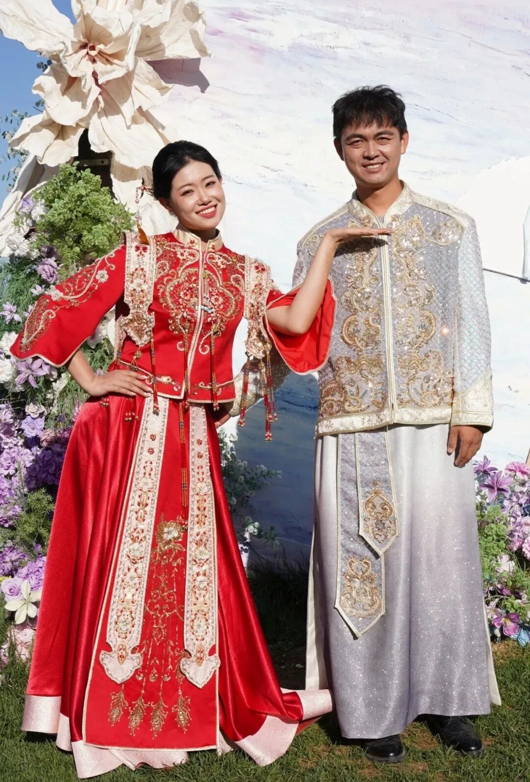 婚礼在《彩云追月》《四合如意》等中国风音乐中温馨开场。随后,激昂的鼓舞表演点燃现场气氛,十对新人身着传统中式礼服,手牵手在亲友与嘉宾的见证下步入仪式现场,开启人生新旅程。