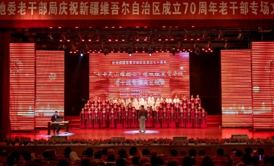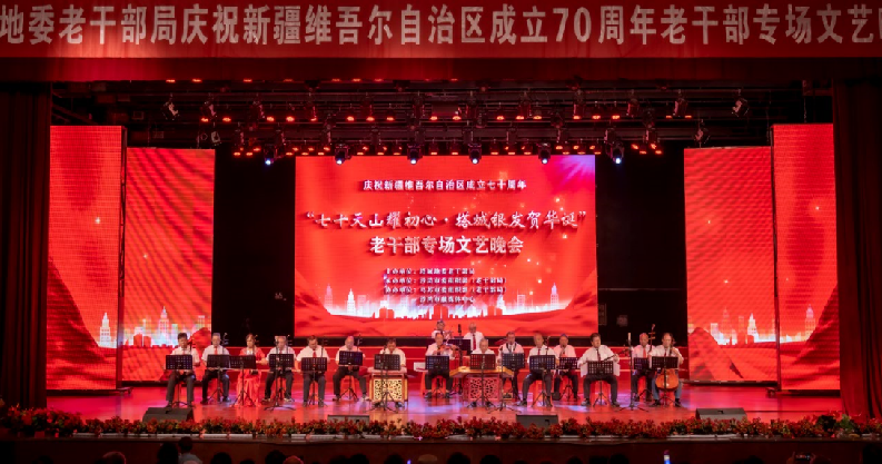 9月1日,塔城地委老干部局“七十天山耀初心·塔城银发贺华诞”庆祝新疆维吾尔自治区成立70周年老干部专场文艺晚会在沙湾市影剧院精彩上演。来自沙湾市、乌苏市的老干部文艺爱好者们齐聚一堂,用歌声、舞姿与乐器,礼赞新疆70年沧桑巨变,抒发对祖国、对家乡的赤诚热爱。