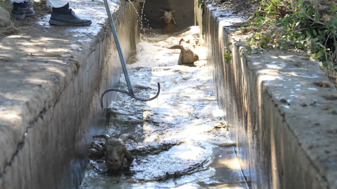 8月28日,沙湾市西戈壁镇五道沟村药浴点,药浴池里浸泡的羊。段江玺 摄