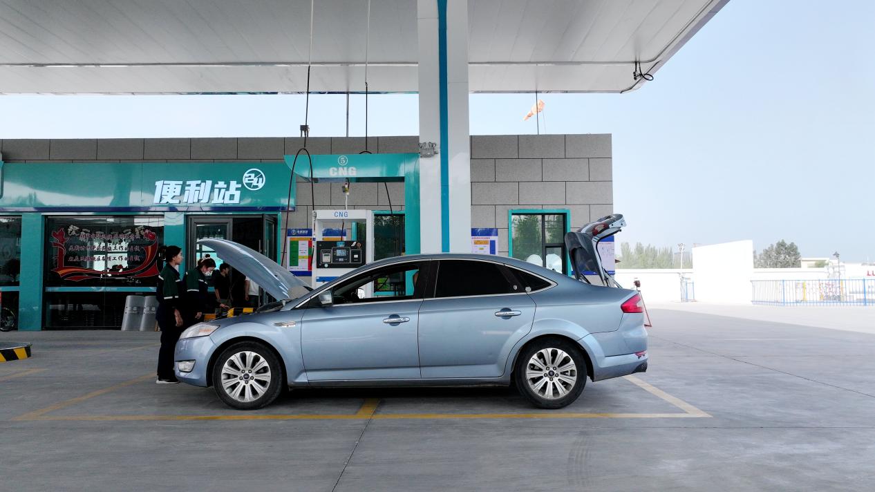 在新疆巨友新能源科技有限公司投资建设的车享醇链加注站内,工作人员给车辆加注天然气燃料(赵新昌 摄)