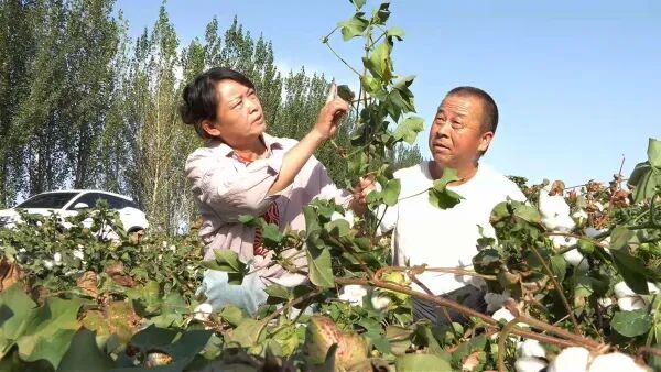 9月6日,市农业农村局技术人员正与农户在棉田查看棉花的长势。马文静摄