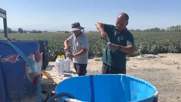 9月6日,农户与无人机飞手正在调配脱叶剂。特来克·木哈买提江摄