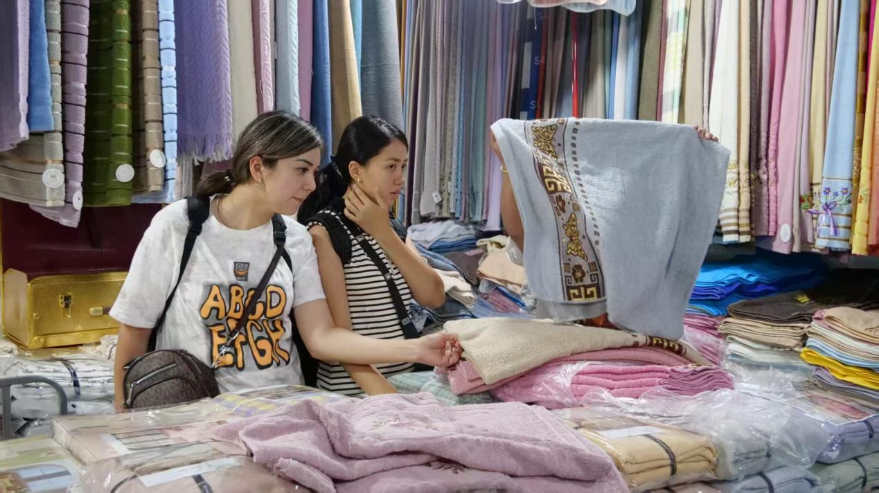 (哈萨克斯坦顾客正在选购纯棉床上用品“四件套”。董智杰 摄)