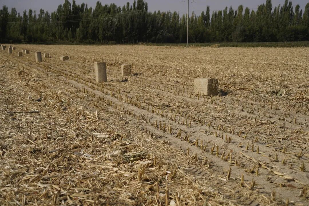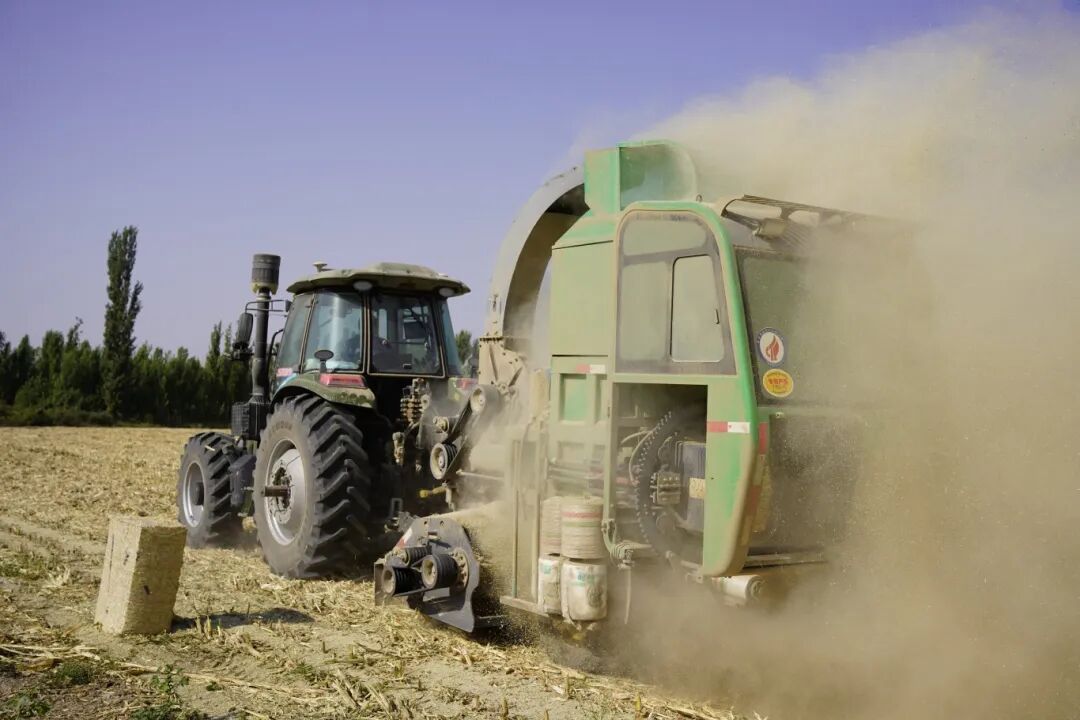 9月8日,在四师可克达拉市六十四团十七连玉米收割后的田间,秸秆饲料捡拾打捆机来回作业,散落秸秆被压缩成规整的饲草包,成为牲畜越冬的“放心粮”。