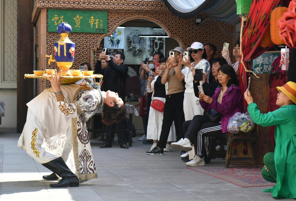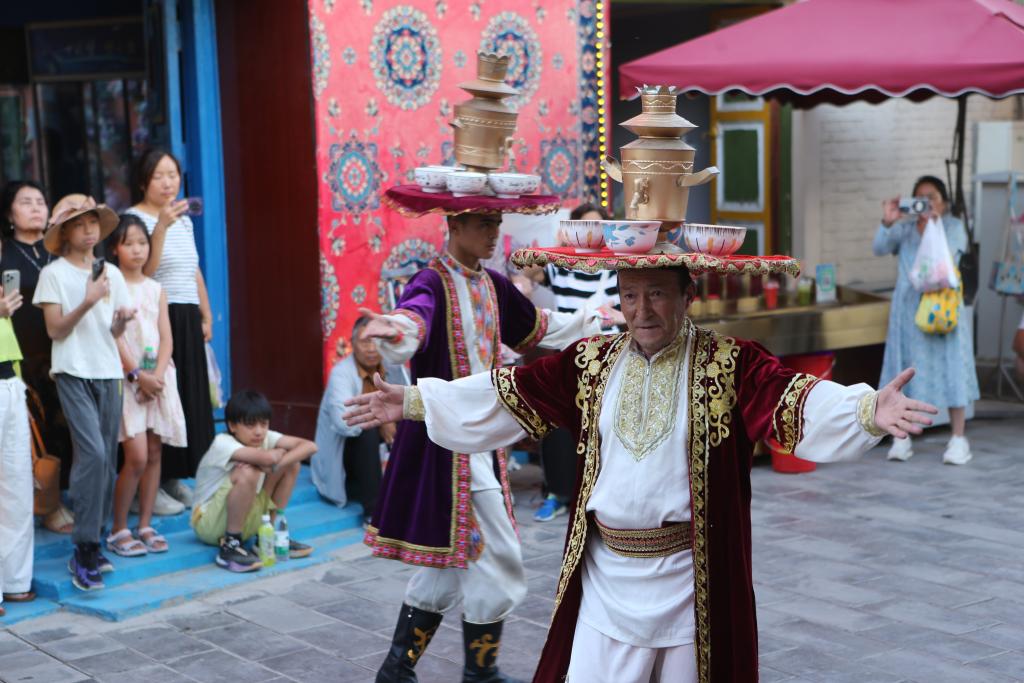 7月22日,在新疆库车市的龟兹小巷,演员表演顶碗舞。新华社记者 王婧嫱 摄