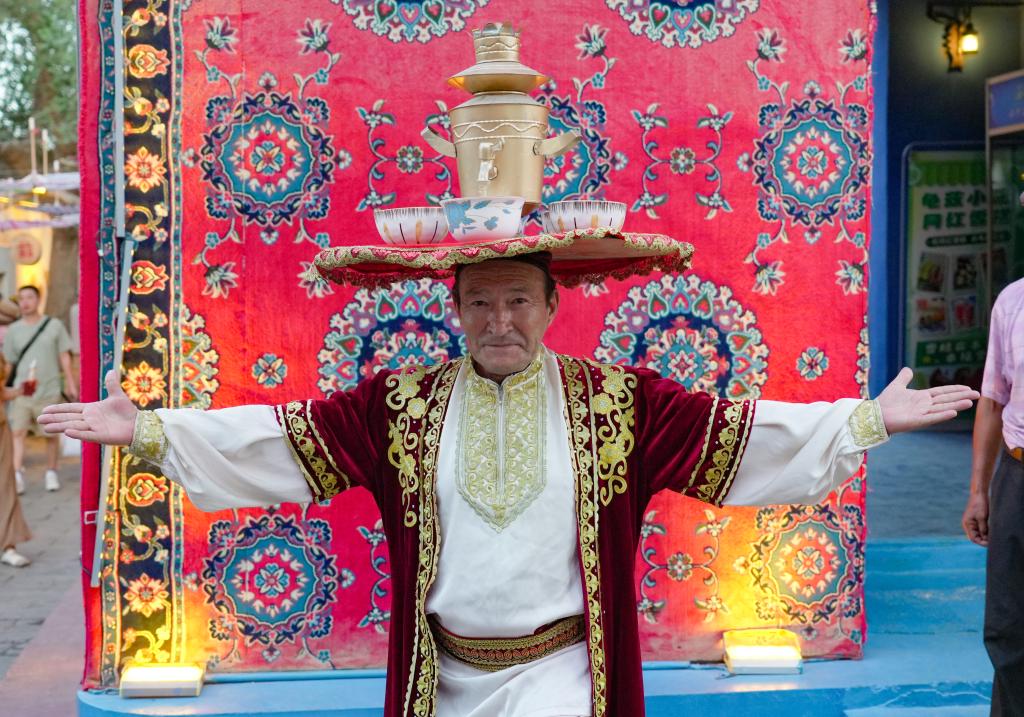 9月9日,在位于新疆乌鲁木齐的大巴扎步行街疆来城,演员在表演萨玛瓦尔舞。新华社记者 王菲 摄