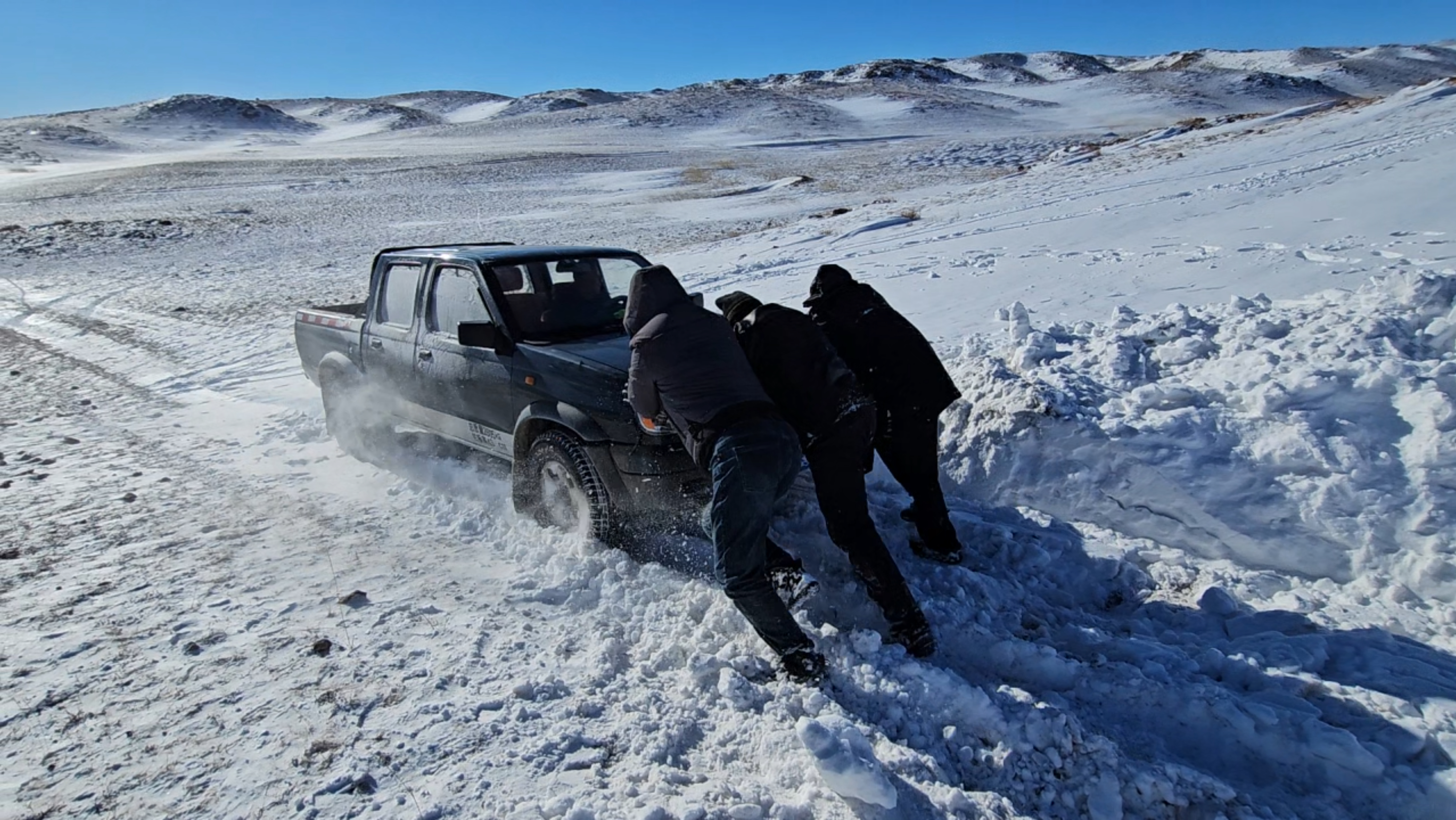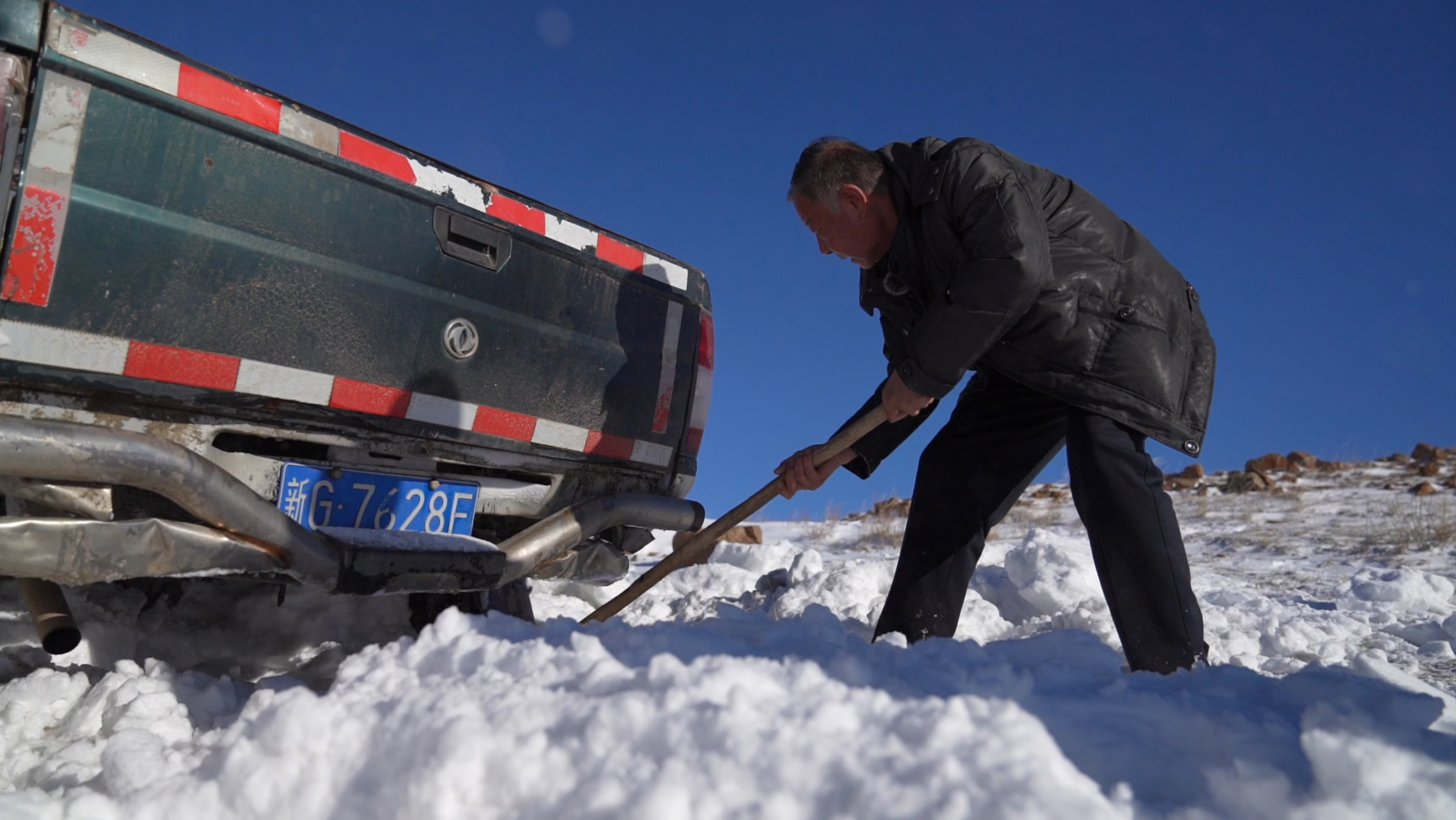 “车子陷进去了,雪又深又硬,怎么弄都出不来。”李琳说。牧民没多言语,他跑到山坡上,捡来几块石头,垫在车轮下,接着和李琳一起,铆足劲推车,可车子纹丝不动。