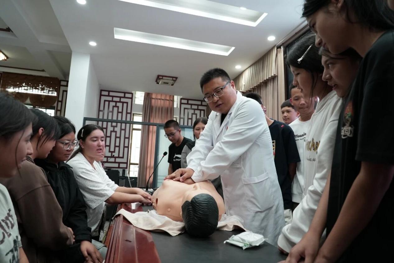 援疆医疗专家通过理论讲解、示范演示、实操练习等方式,介绍了急救的关键要点和注意事项,演示了心肺复苏操作步骤,并设置了模拟环节,进行手把手教学,确保参与者掌握规范的胸外按压与人工呼吸技巧,切实提升急救实操技能。
