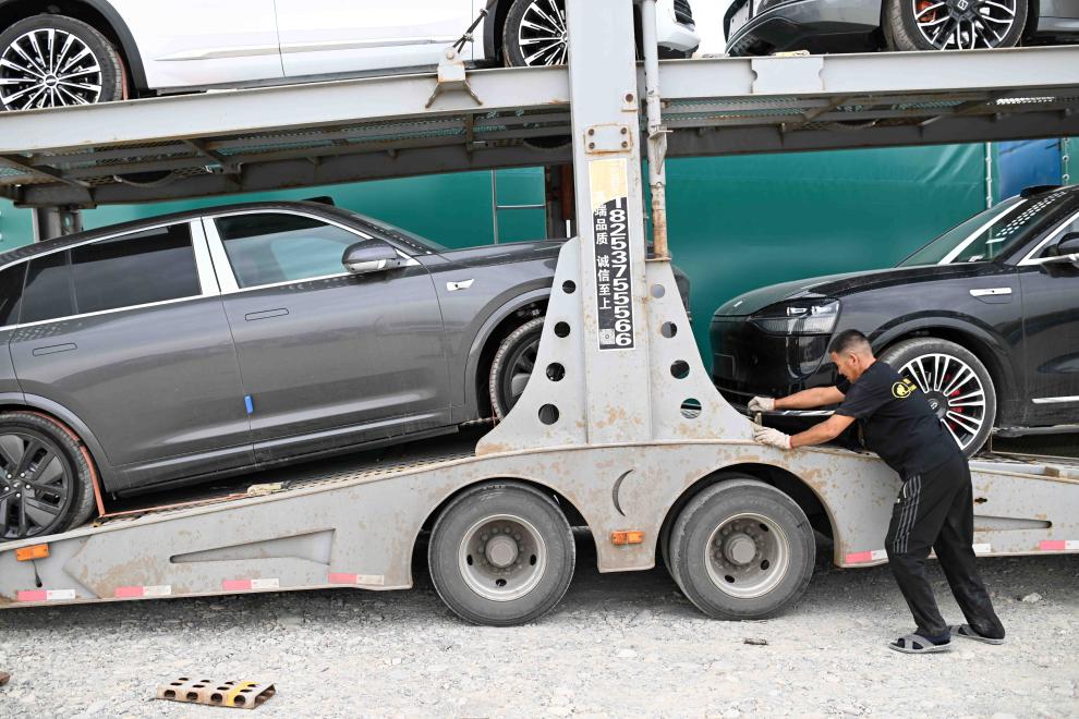 5月23日,在哈萨克斯坦扎尔肯特镇的中转停车场,运输公司工作人员装载进口自中国的汽车。车辆将被运往哈萨克斯坦各大城市、中亚其他国家、俄罗斯等目的地。新华社记者 李任滋 摄