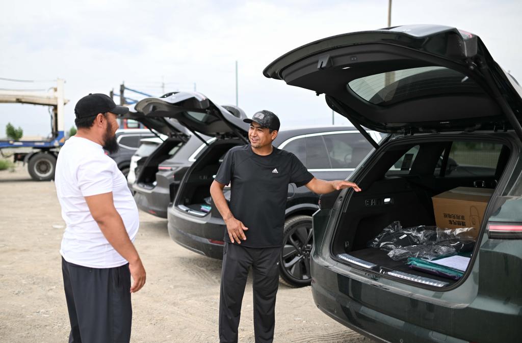 5月23日,在哈萨克斯坦扎尔肯特镇的中转停车场,运输公司工作人员在查看进口自中国的汽车。新华社记者 李任滋 摄