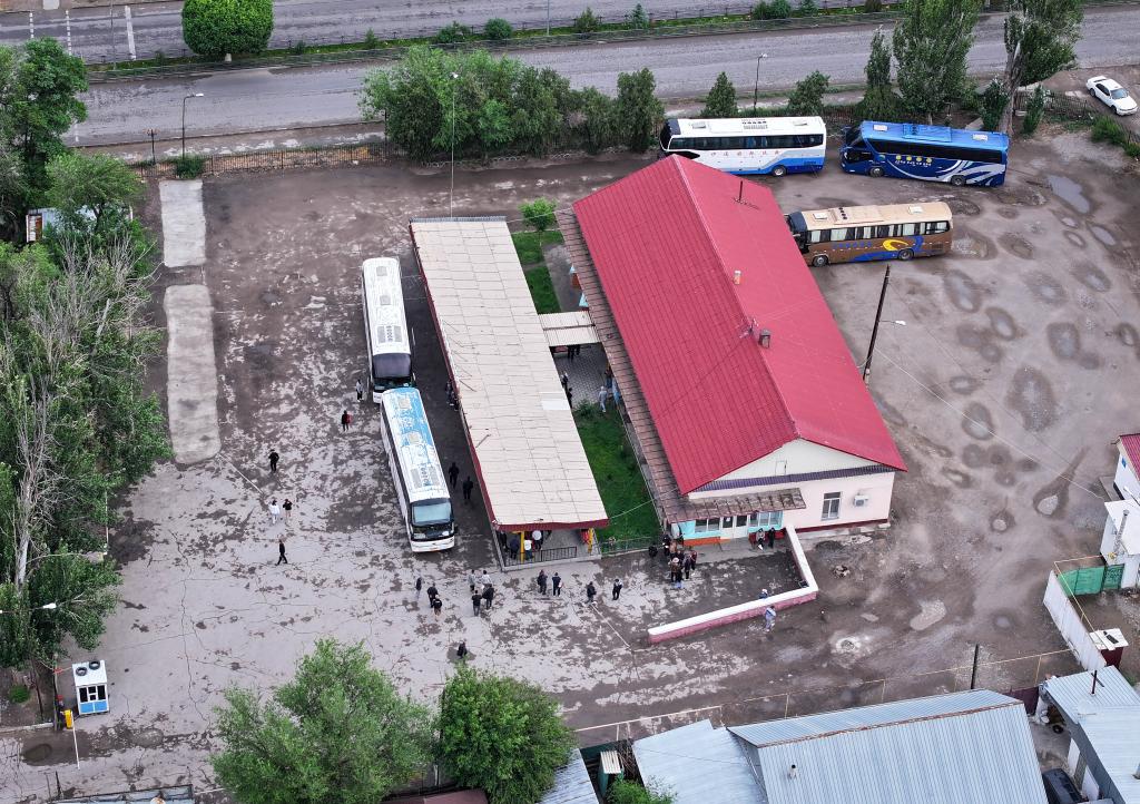 5月24日清晨,“摆渡人”在哈萨克斯坦扎尔肯特镇汽车站准备登上返回霍尔果斯的大巴。新华社记者 李任滋 摄