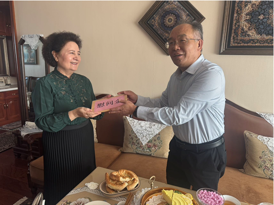 学校党委书记张旭辉为退休教师代表古丽娜尔·玉素甫送去学校的关怀和温暖