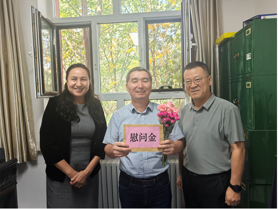 学校党委委员、副校长康华为在职教师代表吾布力·皮大依送去学校的关怀和温暖