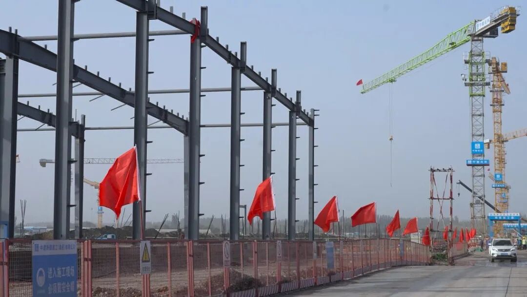 在温宿100万锭棉纺项目施工现场,建设者们通过悬挂横幅、红旗等方式,喜迎新疆维吾尔自治区成立70周年(李亚楠 摄)