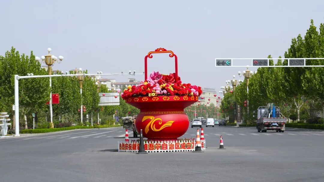 在温宿复兴大道路中心,摆放着精心设计的大型雕塑和花坛,喜迎新疆维吾尔自治区成立70周年(李亚楠 摄)