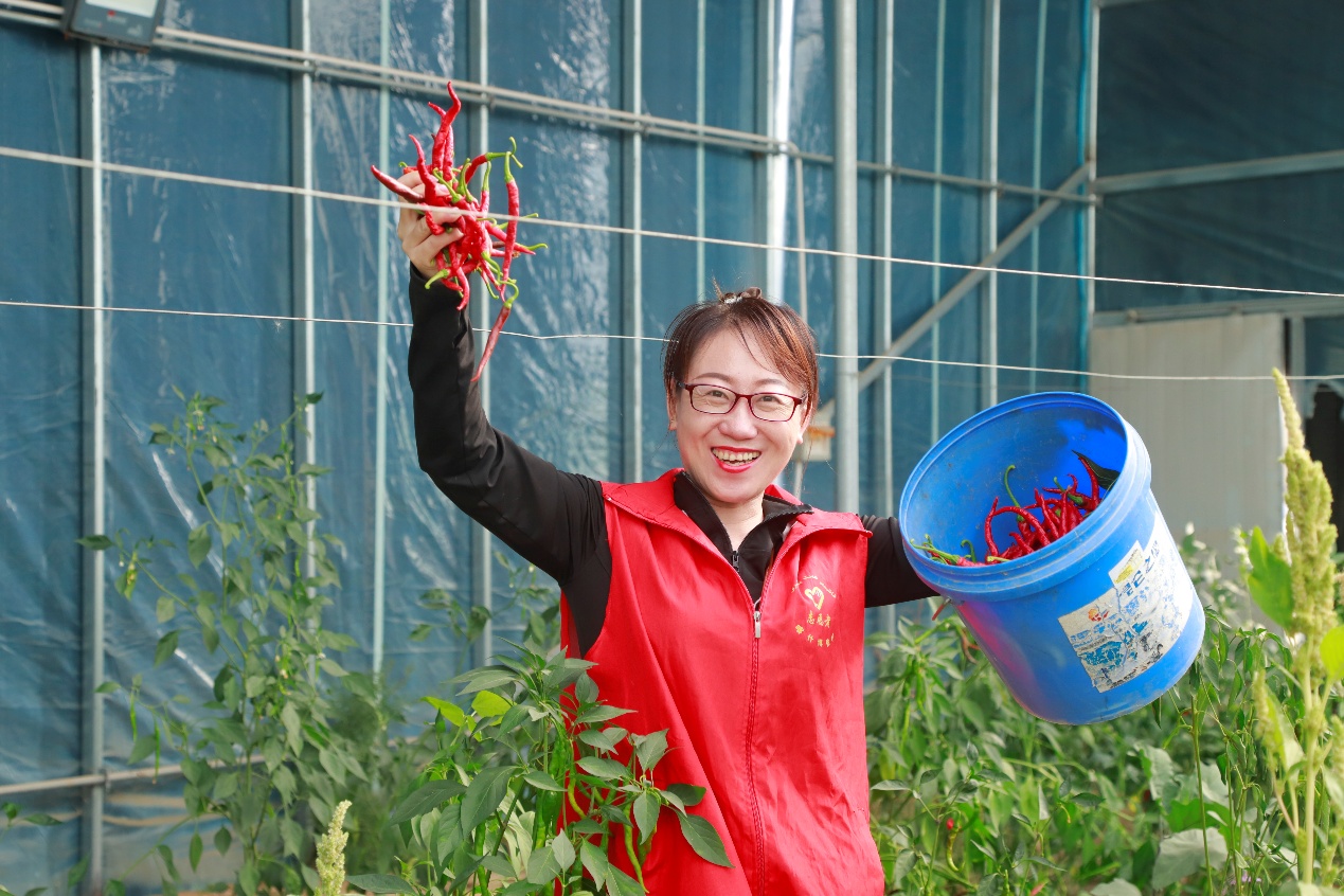 文明实践员看着丰收的辣椒,喜在脸上,美在心里。(张浩 摄)