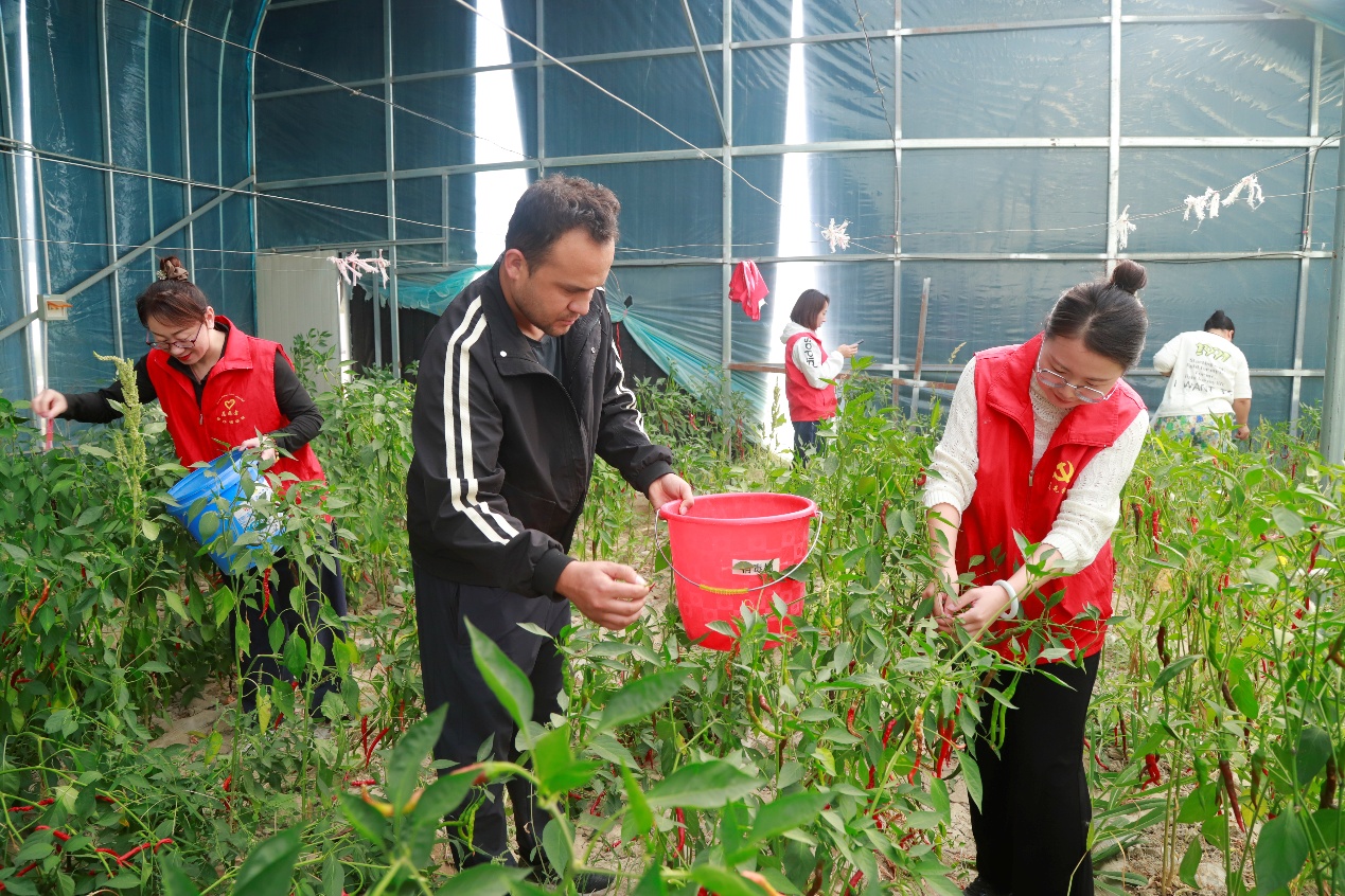 喀什博依村的辣椒棚里,新时代文明实践站文明实践员们与工人采收辣椒。(张浩 摄)