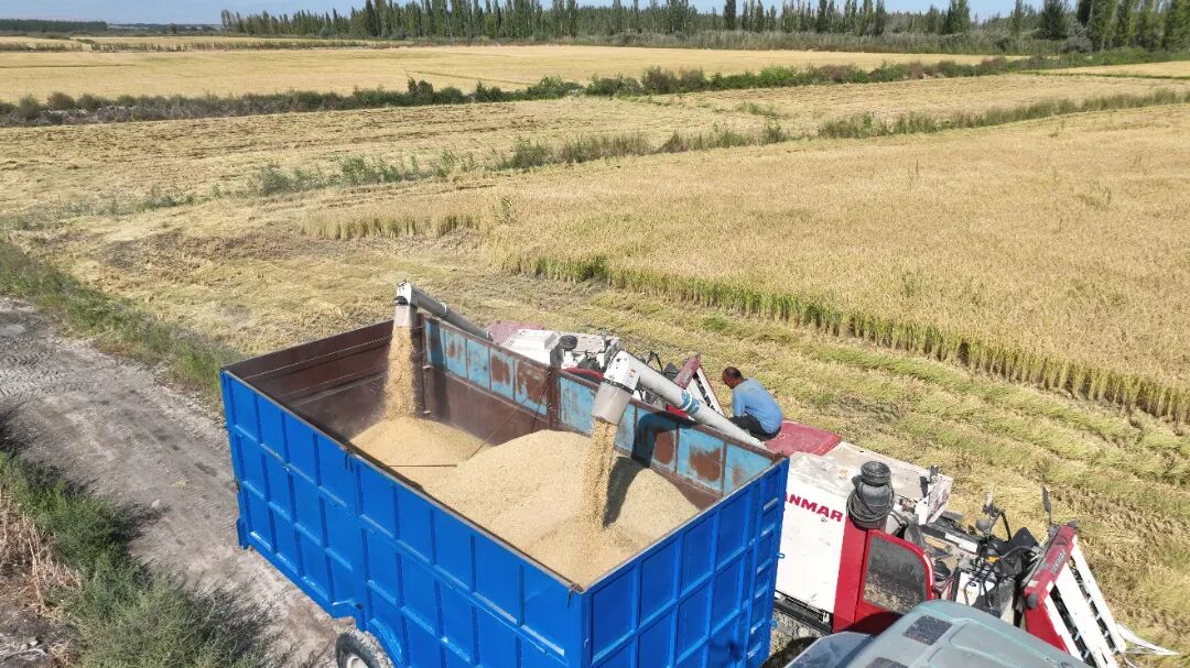 笔者在四师可克达拉市六十八团十连职工蔡珍宝的水稻地里看到,联合收割机往来穿梭,切割、脱粒、秸秆粉碎等工序一气呵成,金色的稻谷源源不断地涌入运输车,不一会儿便装满整车。