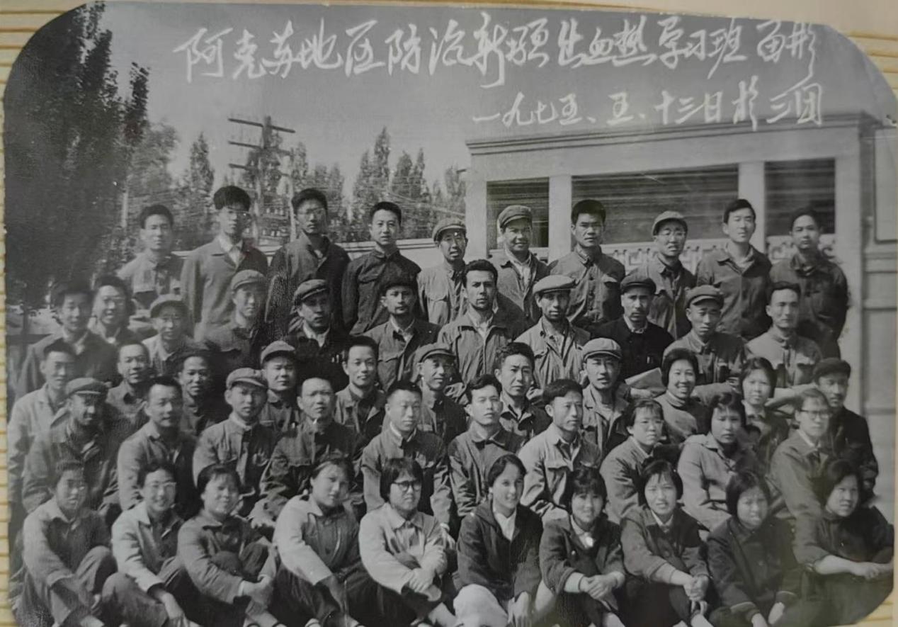 1975年,马玉梁在阿克苏地区防治新疆出血热学习班留影。(三排左三为马玉梁)