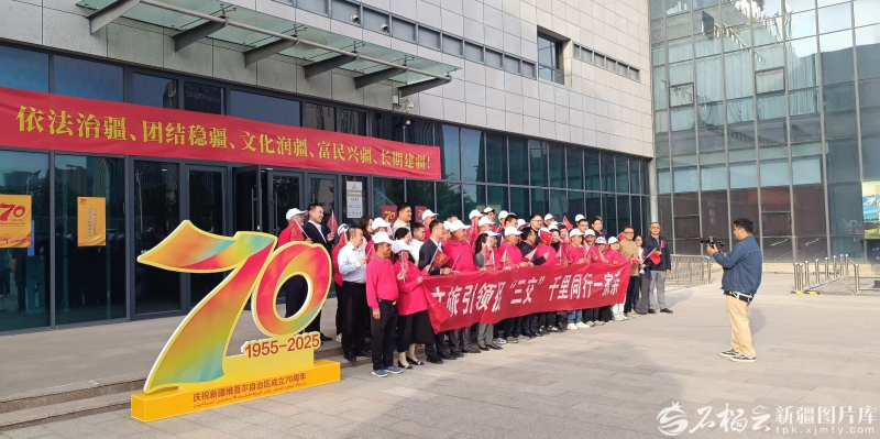 来自喀什乡村的党员群众在新疆文旅数字博览中心前合影。石榴云/新疆日报记者任江 摄