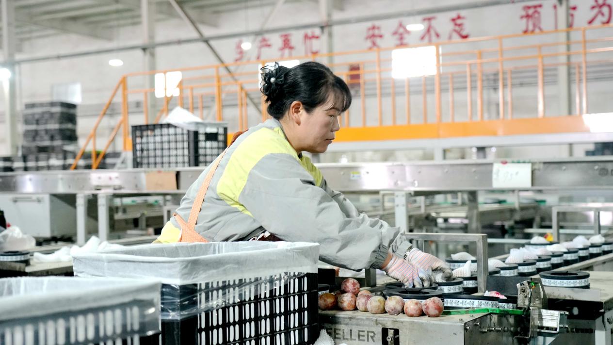 供应链的“韧性”还体现在仓储物流环节。公司配套建设的仓储物流基地,拥有48间冷库,总库容达1万吨,可高效完成农产品仓储与中转。这段时间,上海会会果品有限责任公司总经理刘小琴正带领员工在此分拣打包水蜜桃苹果、“恐龙蛋”,再通过冷链车发往上海、江苏、浙江等市场。