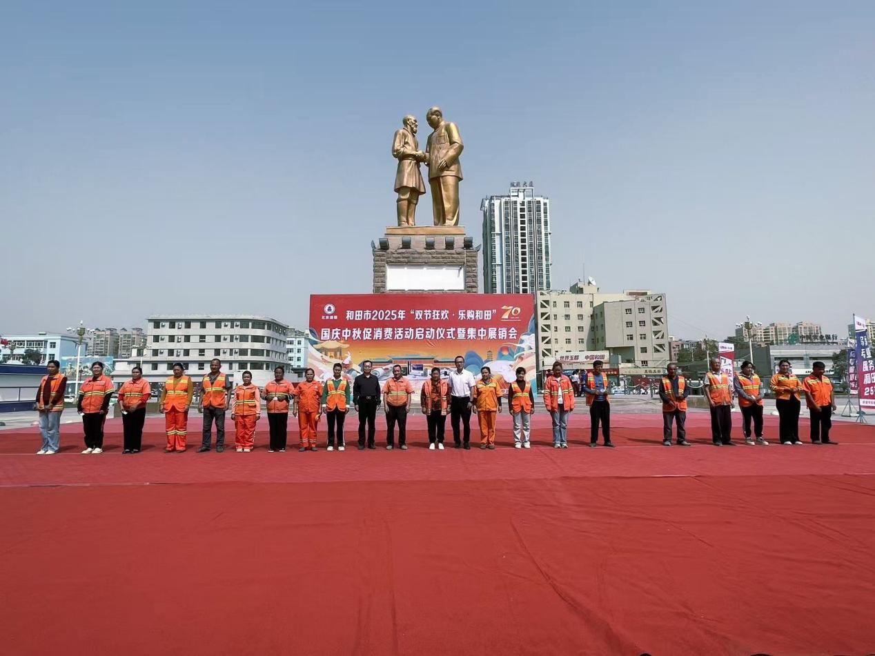启动仪式现场,开场舞《洒满阳光的和田》、合唱《和田是个好地方》、集体舞《祖国母亲》等节目精彩上演,现场气氛热烈。地区商务局、市委相关领导还一同为环卫工人代表发放了消费券。