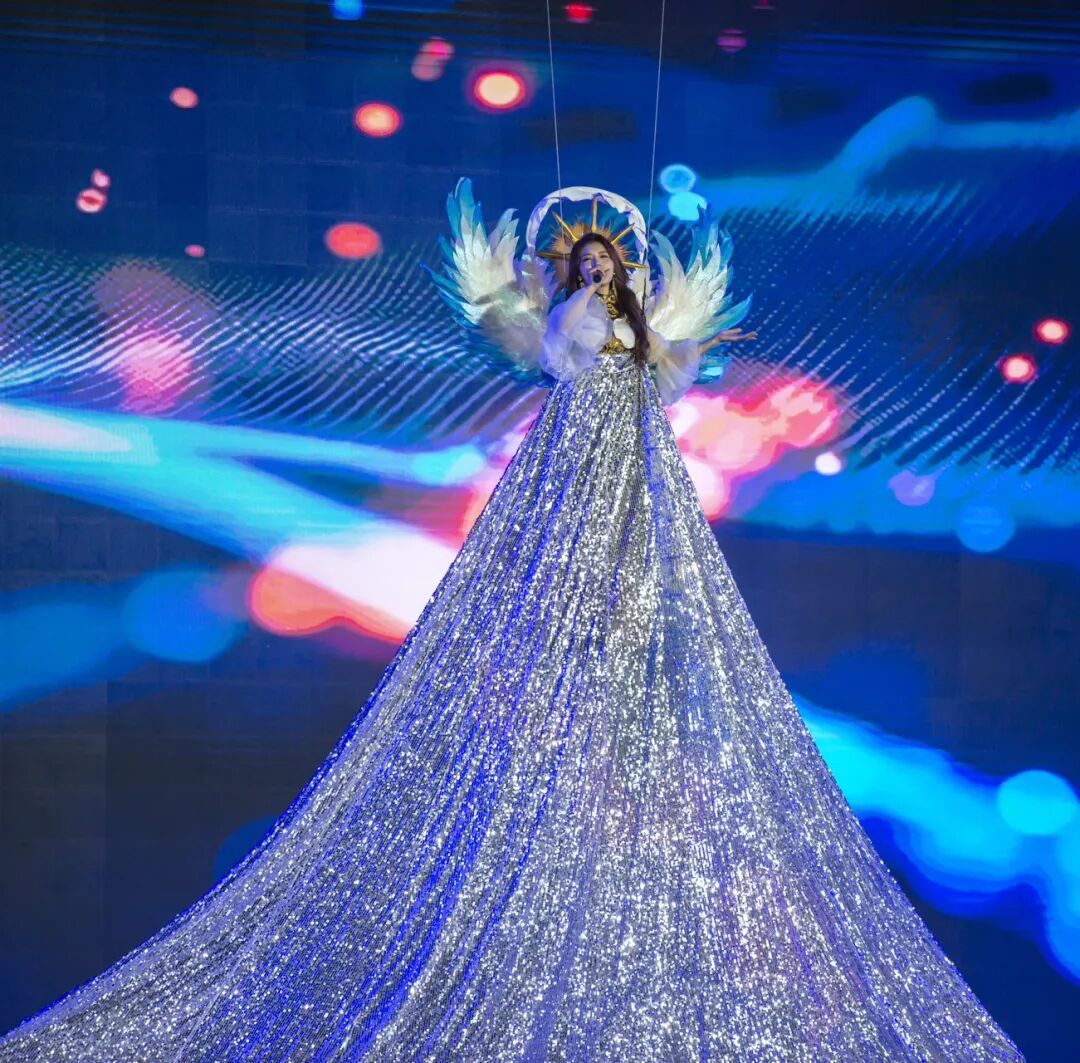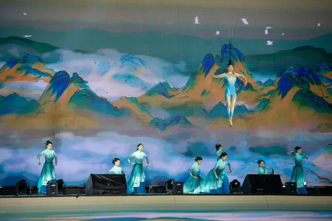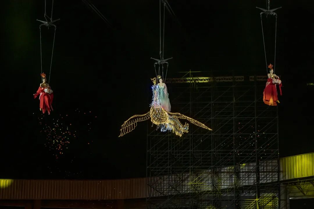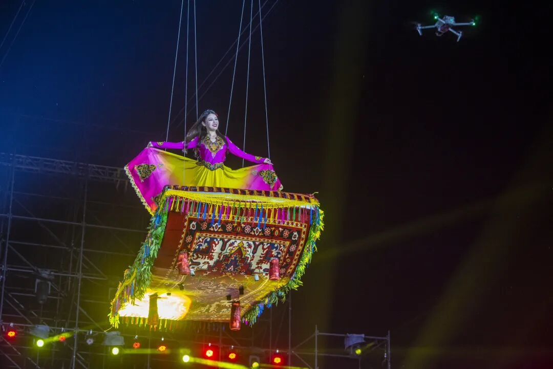 演出中,来自辽宁省文艺工作者精心准备的威亚秀表演更是将现场氛围推向新的高潮。创意融合威亚秀《鹿角情》以沙湾鹿角湾为灵感,演员空中舒展的身姿勾勒出自然与艺术的融合之美;激光威亚秀《未来之光》则通过炫酷效果,展现沙湾智慧农业、氢能产业等科技发展成果和未来发展的美好愿景;威亚秀《丝路汇祥瑞》里的飞天仙女、金龙彩凤升空的画面,更是引得现场观众阵阵欢呼,大家纷纷举起手机记录这一精彩瞬间。