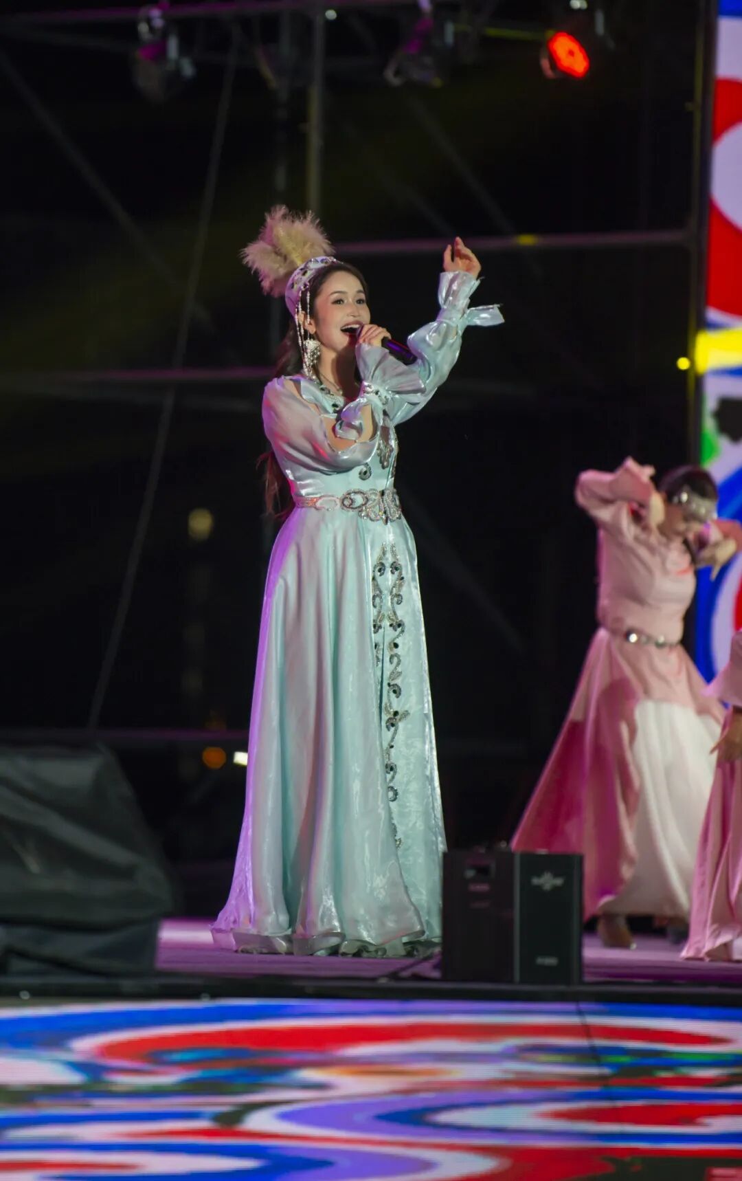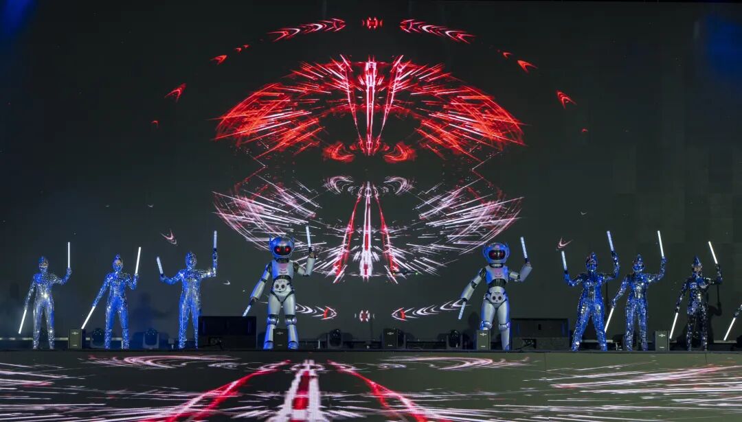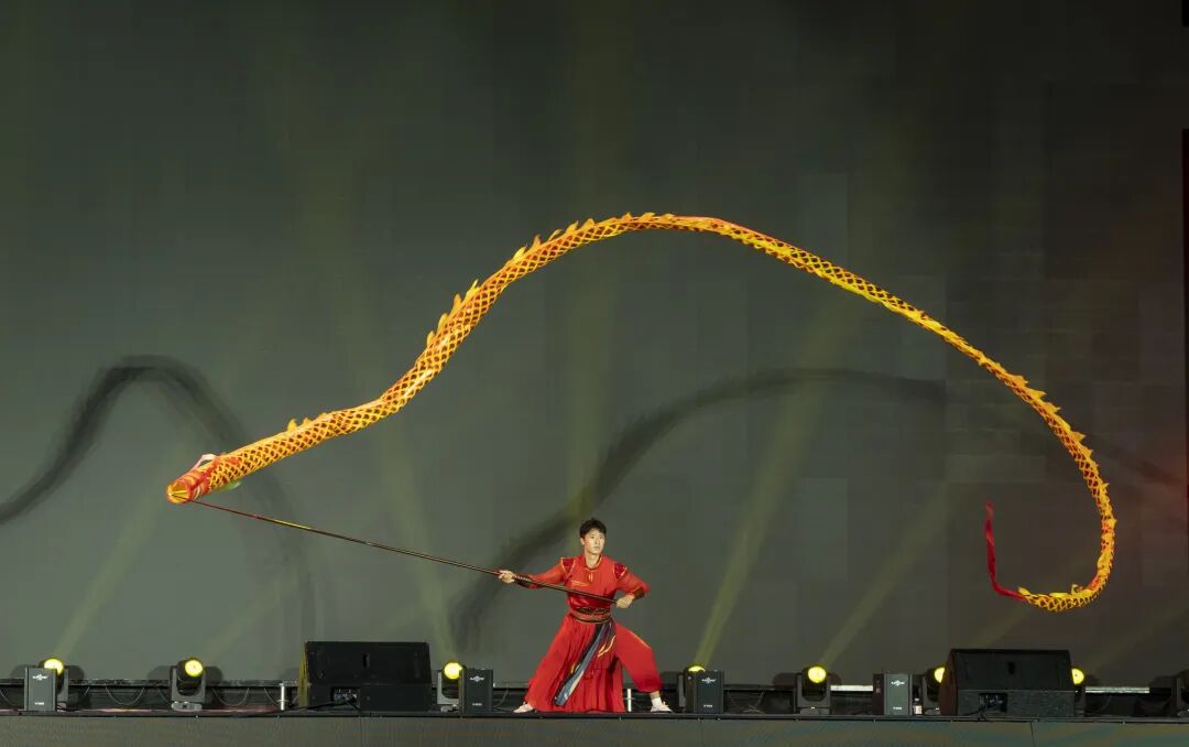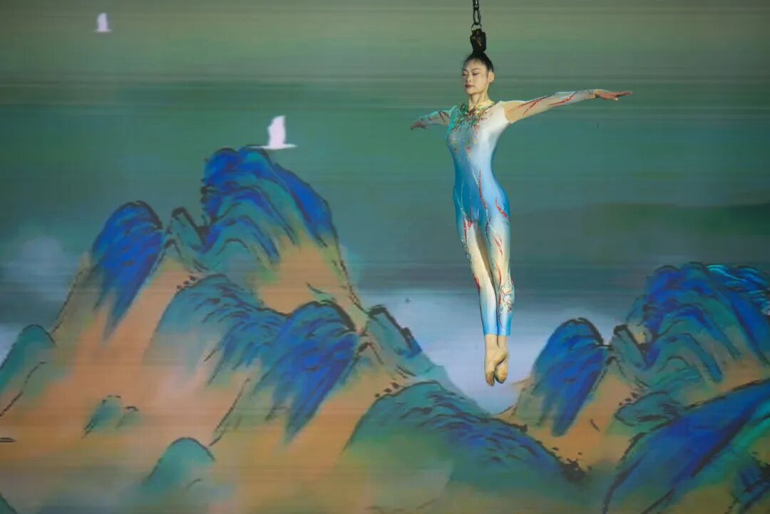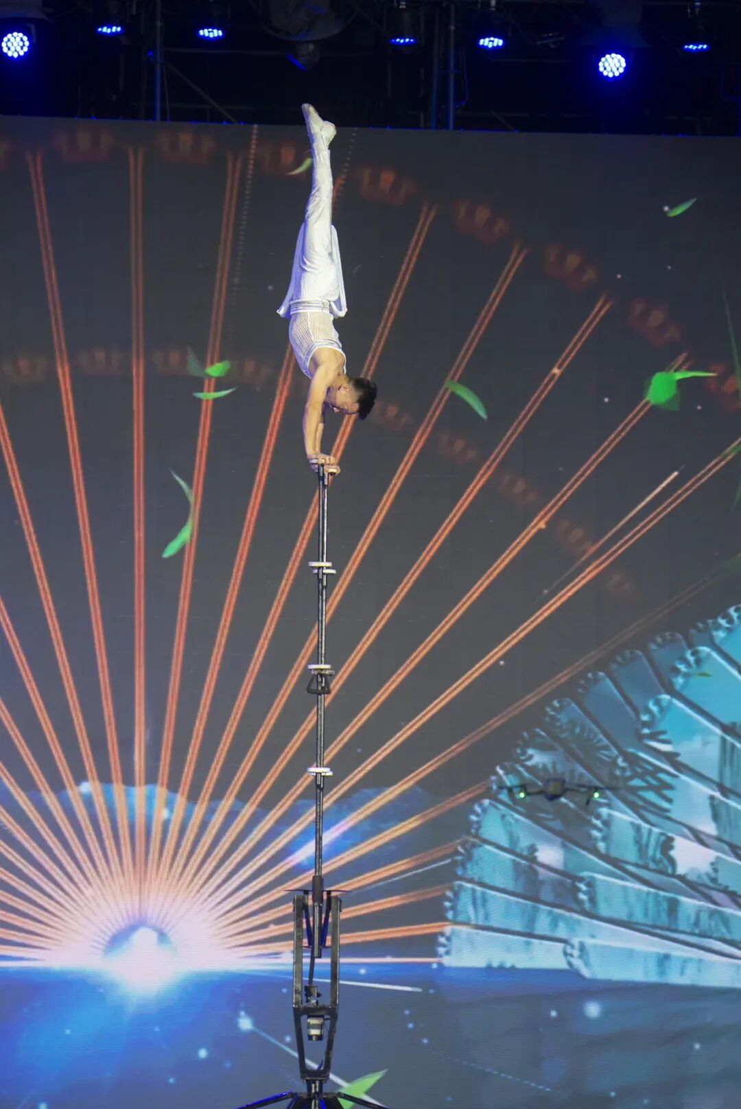 演出中,来自辽宁省文艺工作者精心准备的威亚秀表演更是将现场氛围推向新的高潮。创意融合威亚秀《鹿角情》以沙湾鹿角湾为灵感,演员空中舒展的身姿勾勒出自然与艺术的融合之美;激光威亚秀《未来之光》则通过炫酷效果,展现沙湾智慧农业、氢能产业等科技发展成果和未来发展的美好愿景;威亚秀《丝路汇祥瑞》里的飞天仙女、金龙彩凤升空的画面,更是引得现场观众阵阵欢呼,大家纷纷举起手机记录这一精彩瞬间。