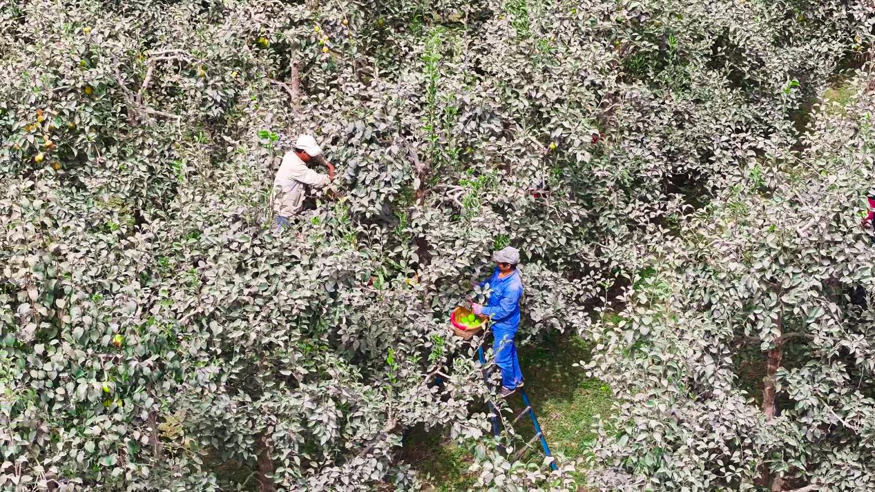 近日,九团梨花镇3万余亩香梨全面开启采摘。在十五连的果园里,工人们穿梭林间,熟练完成采摘、分拣、包装,现场一派火热。