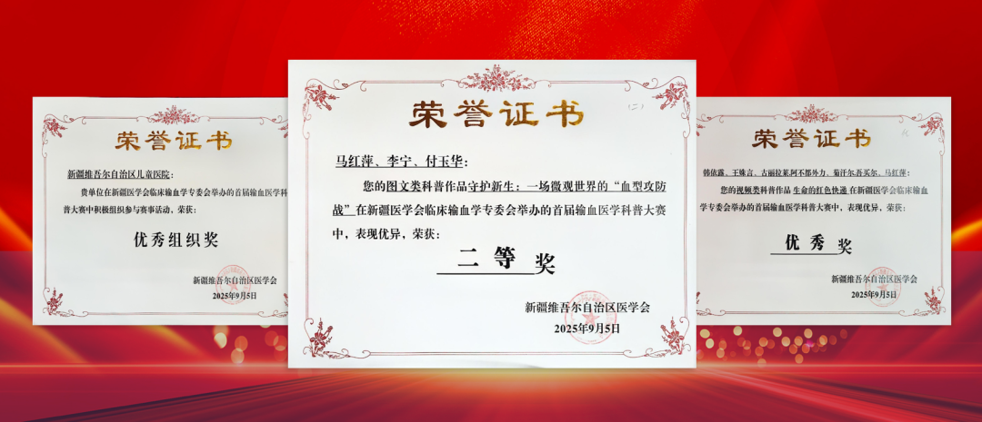 近日,新疆首届输血医学科普大赛落幕,自治区儿童医院(北京儿童医院新疆医院)输血科团队凭借创新科普作品与卓越组织能力,从全疆众多参赛单位中脱颖而出,一举斩获图文类科普作品《守护新生:一场微观世界的“血型攻防战”》二等奖、视频类科普作品《生命的红色快递》优秀奖及优秀组织奖三项荣誉。