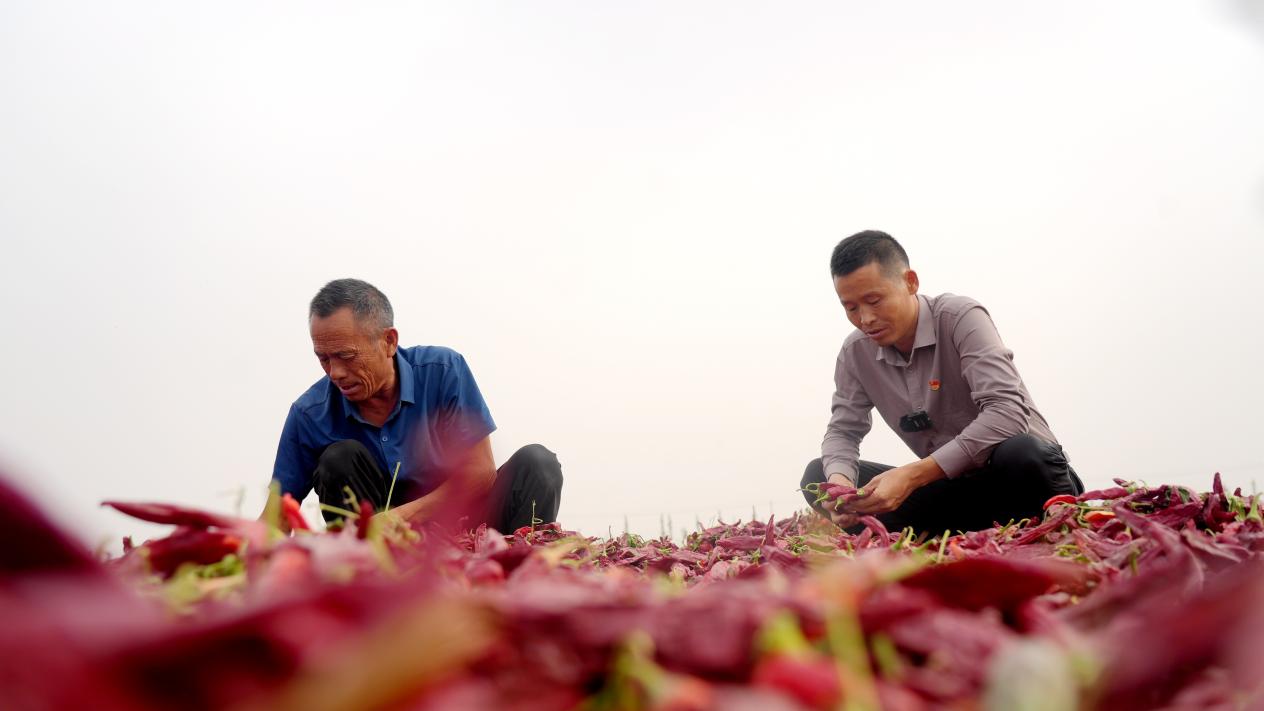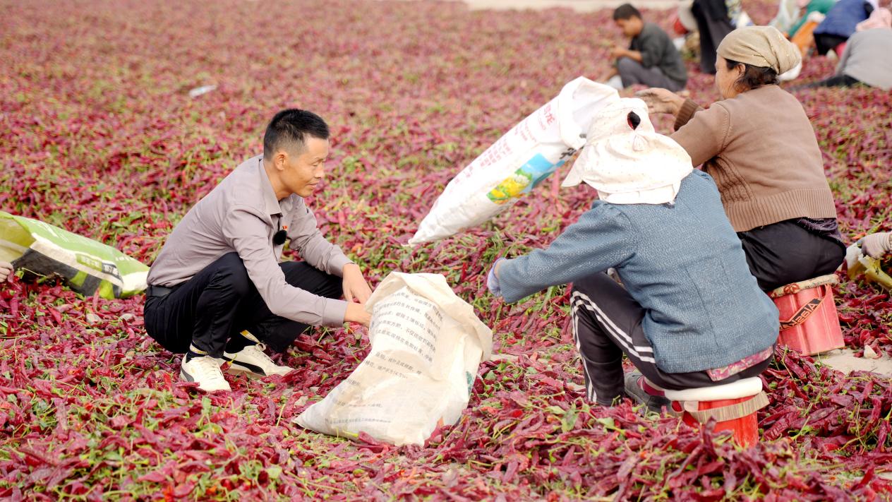 阿克苏亿泓农业开发有限公司、阿克苏椒阳农业科技有限公司的总经理肖体健在辣椒晒场与种植户亲密交谈,了解今年辣椒种植情况(赵新昌 摄)